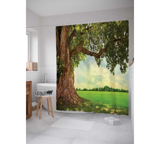 Штора (занавеска) для ванной JoyArty "Дерево на зеленой поляне" из сатена, 180х200 см с крючками, sc_7515