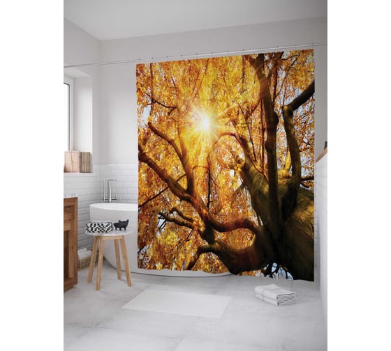 Штора (занавеска) для ванной JoyArty "Дерево поймало солнце" из сатена, 180х200 см с крючками, sc_20676