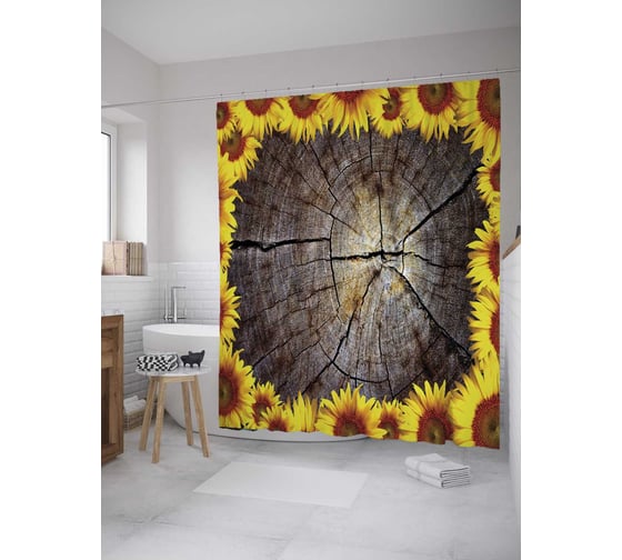 Штора (занавеска) для ванной JoyArty "Дерево в подсолнухах" из сатена, 180х200 см с крючками, sc_9856