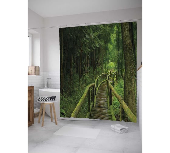Штора (занавеска) для ванной JoyArty "Деревянная дорога в лесу" из сатена, 180х200 см с крючками, sc_32567