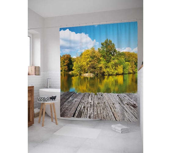Штора (занавеска) для ванной JoyArty "Деревянный мост у озера" из сатена, 180х200 см с крючками, sc_30026