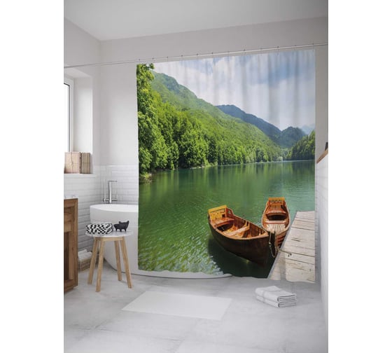 Штора (занавеска) для ванной JoyArty "Деревянный причал на озере" из сатена, 180х200 см с крючками, sc_28442