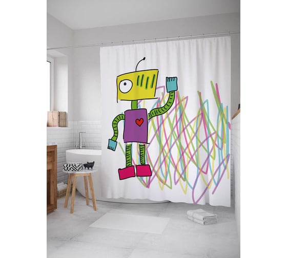 Штора (занавеска) для ванной JoyArty "Добрый робот" из сатена, 180х200 см с крючками, sc_18671
