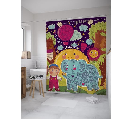 Штора (занавеска) для ванной JoyArty "Дружба со слоном" из сатена, 180х200 см с крючками, sc_60467