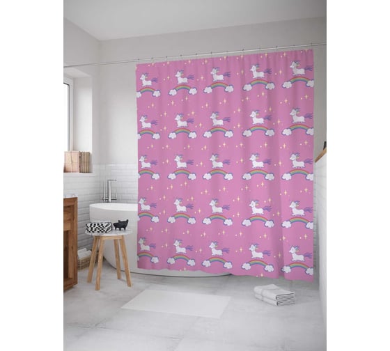Штора (занавеска) для ванной JoyArty "Единорог на радуге" из сатена, 180х200 см с крючками, sc_19538