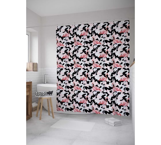 Штора (занавеска) для ванной JoyArty "Фламинго на пятнах" из сатена, 180х200 см с крючками, sc_34613