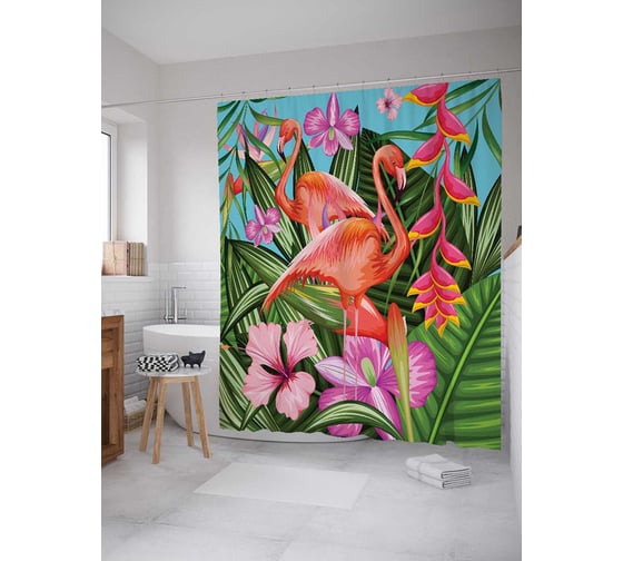 Сопутствующие товары для шторки-занавески JOYARTY Фламинго в цветах из сатена, 180х200 см с крючками
