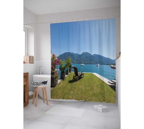 Штора (занавеска) для ванной JoyArty "Газон на террасе" из сатена, 180х200 см с крючками, sc_34957