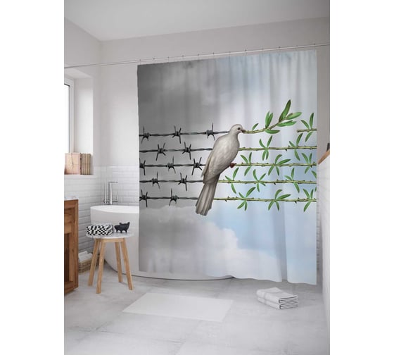 Штора (занавеска) для ванной JoyArty "Голубь между проволокой и ветками" из сатена, 180х200 см с крючками, sc_12003