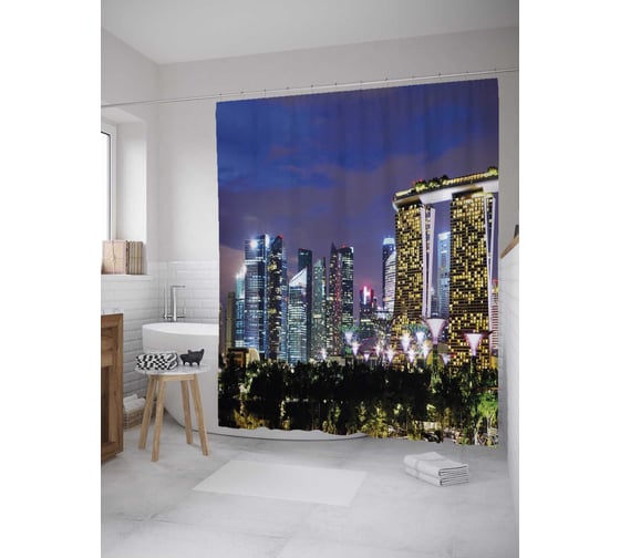 Штора (занавеска) для ванной JoyArty "Горизонт ночного Сингапура" из сатена, 180х200 см с крючками, sc_36526