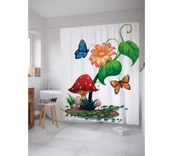 Штора (занавеска) для ванной JoyArty "Грибной цветок" из сатена, 180х200 см с крючками, sc_15983