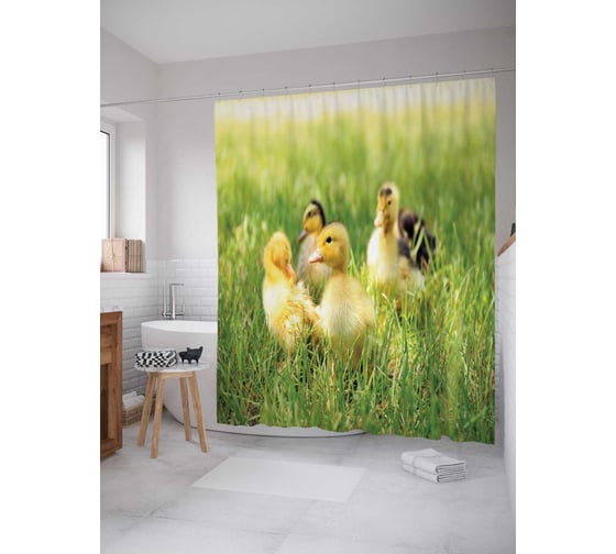 Штора (занавеска) для ванной JoyArty "Гусята в траве" из сатена, 180х200 см с крючками, sc_6568