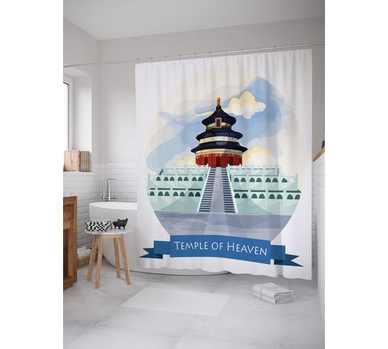Штора (занавеска) для ванной JoyArty "Храм Неба" из сатена, 180х200 см с крючками, sc_52782
