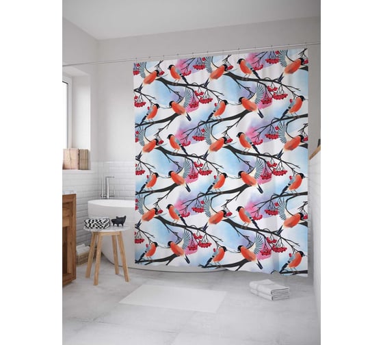 Сопутствующие товары для шторки-занавески JOYARTY Снегири на рябиновых ветках из сатена, 180х200 см с крючками