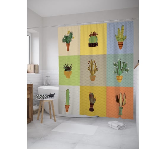 Штора (занавеска) для ванной JoyArty "Кактусовый коллаж" из сатена, 180х200 см с крючками, sc_59456