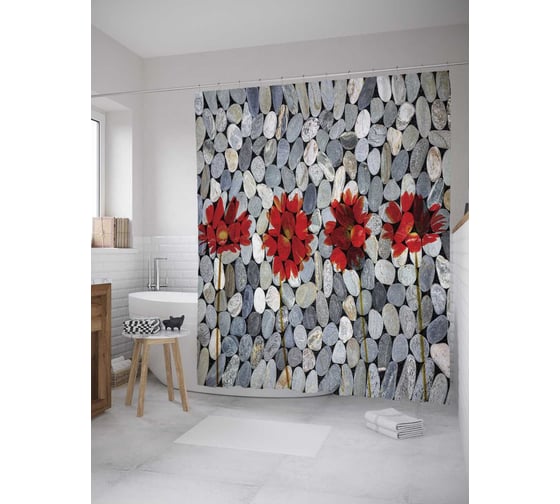 Штора (занавеска) для ванной JoyArty "Камни в цветах" из сатена, 180х200 см с крючками, sc_8531