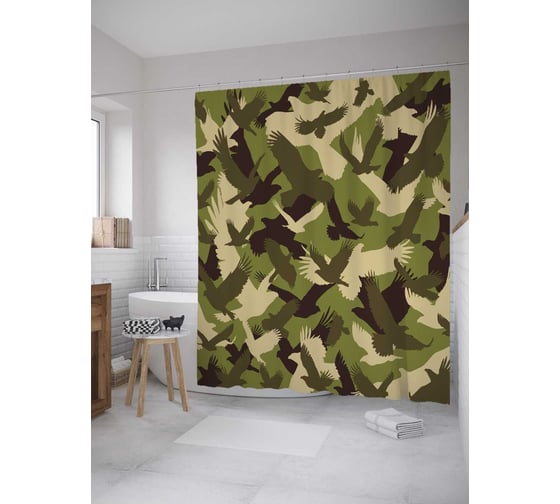Штора (занавеска) для ванной JoyArty "Камуфляжные птицы" из сатена, 180х200 см с крючками, sc_34623