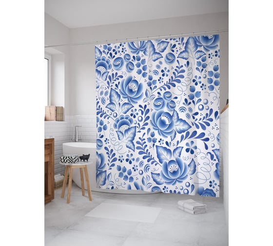 Штора (занавеска) для ванной JoyArty "Керамическая гжель" из сатена, 180х200 см с крючками, sc_62522