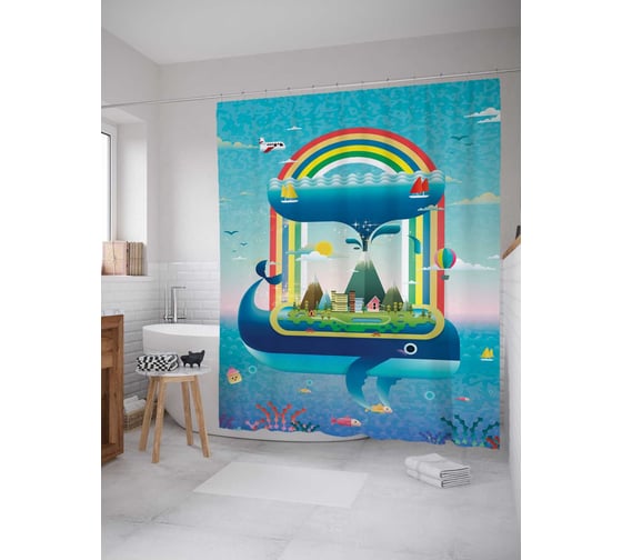 Штора (занавеска) для ванной JoyArty "Китовый остров" из сатена, 180х200 см с крючками, sc_23204