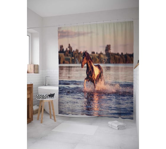 Штора (занавеска) для ванной JoyArty "Конь пересекает реку" из сатена, 180х200 см с крючками, sc_16151