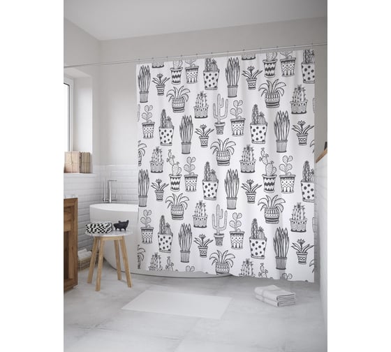 Штора (занавеска) для ванной JoyArty "Контурные кактусы" из сатена, 180х200 см с крючками, sc_59463