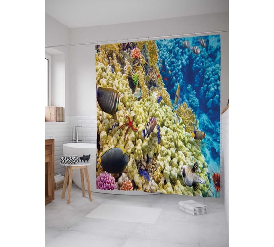 Штора (занавеска) для ванной JoyArty "Коралловые рифы" из сатена, 180х200 см с крючками, sc_14606