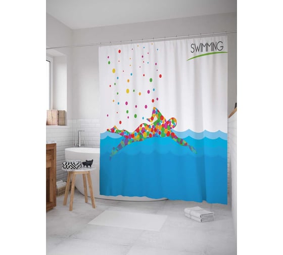 Штора (занавеска) для ванной JoyArty "Красочное плавание" из сатена, 180х200 см с крючками, sc_17497