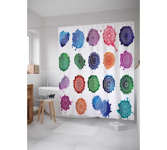 Штора (занавеска) для ванной JoyArty "Красочные пятна с узорами" из сатена, 180х200 см с крючками, sc_16066
