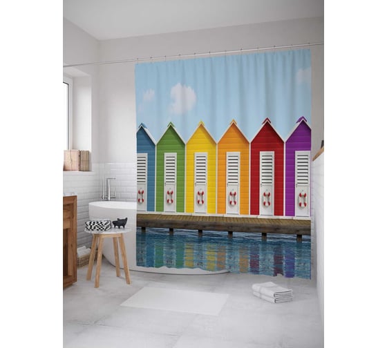 Штора (занавеска) для ванной JoyArty "Курортные домики" из сатена, 180х200 см с крючками, sc_13829