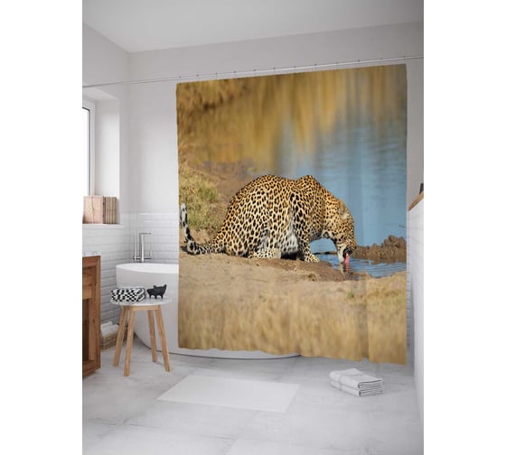Штора (занавеска) для ванной JoyArty "Леопард у водоема" из сатена, 180х200 см с крючками, sc_16490