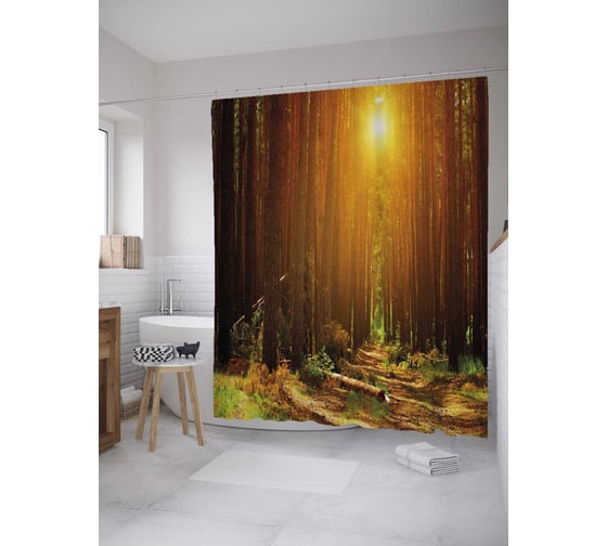 Штора (занавеска) для ванной JoyArty "Лесной восход" из сатена, 180х200 см с крючками, sc_28106