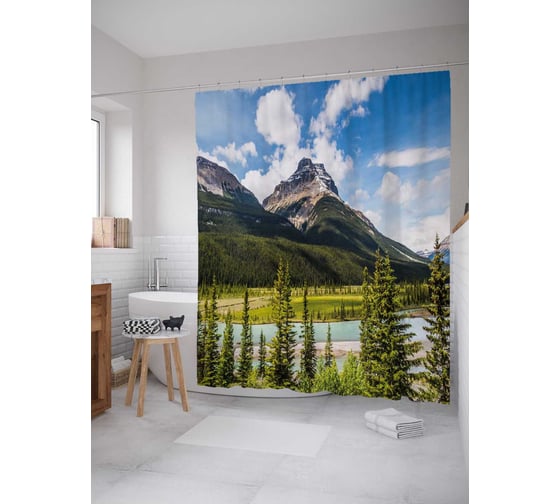 Штора (занавеска) для ванной JoyArty "Лесные горы" из сатена, 180х200 см с крючками, sc_21526