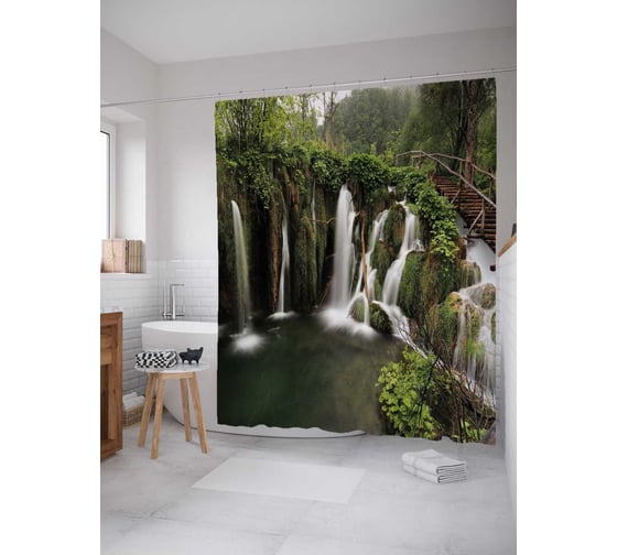 Штора (занавеска) для ванной JoyArty "Лестница вдоль водопада" из сатена, 180х200 см с крючками, sc_21813