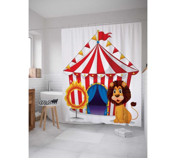 Штора (занавеска) для ванной JoyArty "Лев трюкач" из сатена, 180х200 см с крючками, sc_12743