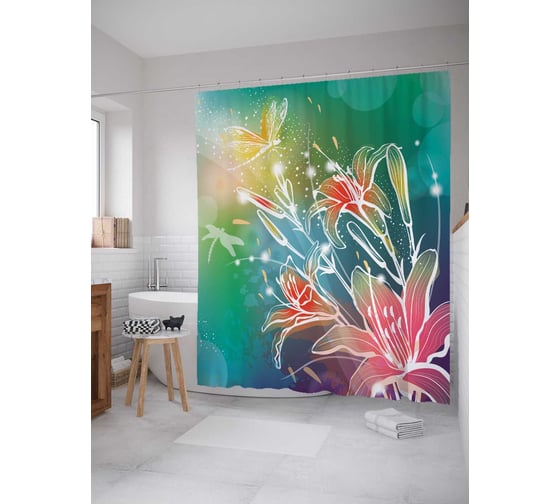 Штора (занавеска) для ванной JoyArty "Лилии и стрекоза" из сатена, 180х200 см с крючками, sc_35193