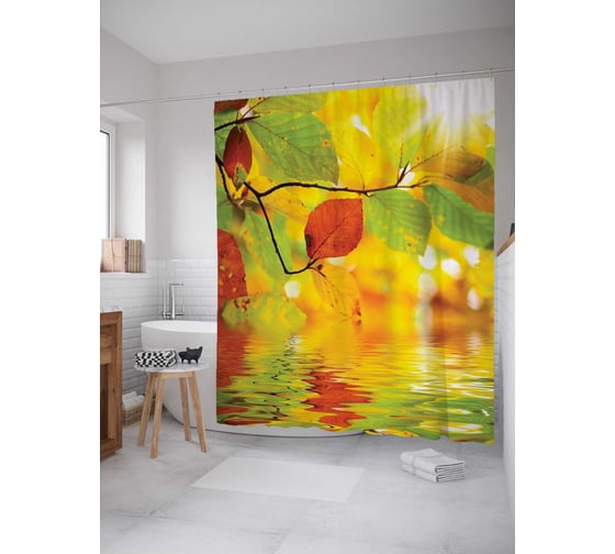 Штора (занавеска) для ванной JoyArty "Лиственное отражение" из сатена, 180х200 см с крючками, sc_7116
