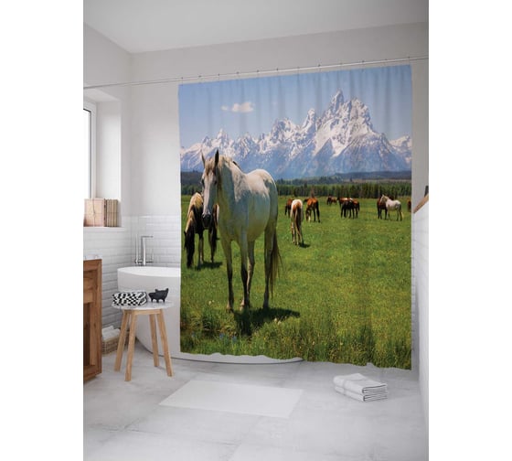 Штора (занавеска) для ванной JoyArty "Лошади на горном пастбище" из сатена, 180х200 см с крючками, sc_20751