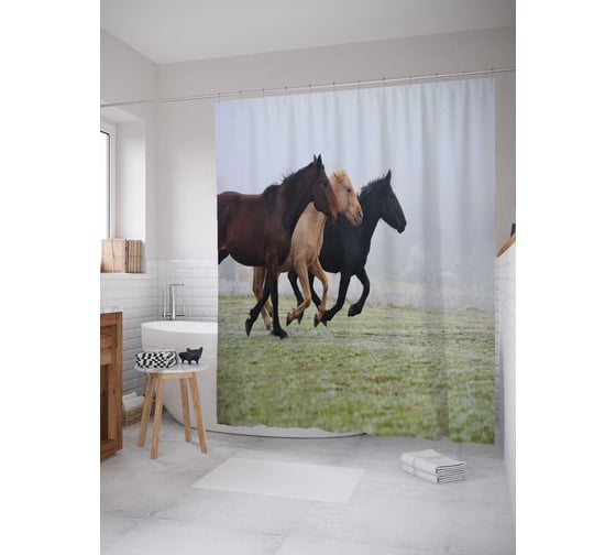 Штора (занавеска) для ванной JoyArty "Лошади стремятся к цели" из сатена, 180х200 см с крючками, sc_16148