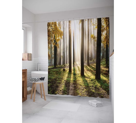 Штора (занавеска) для ванной JoyArty "Лучистый лес" из сатена, 180х200 см с крючками, sc_15217