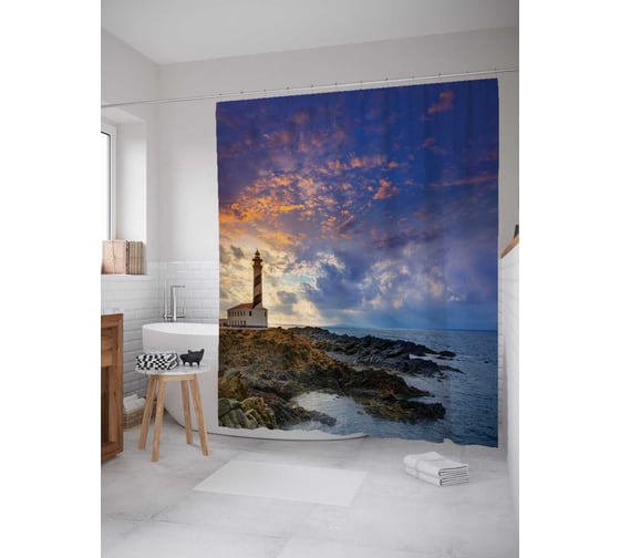 Штора (занавеска) для ванной JoyArty "Маяк близко" из сатена, 180х200 см с крючками, sc_12362