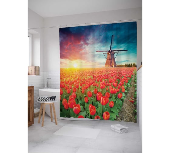 Штора (занавеска) для ванной JoyArty "Мельница на поле тюльпанов" из сатена, 180х200 см sc_378864