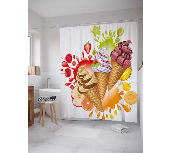 Штора (занавеска) для ванной JoyArty "Мороженое с ягодами" из сатена, 180х200 см с крючками, sc_36327