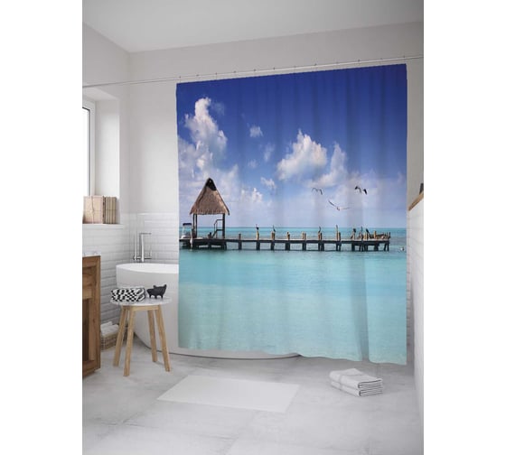 Штора (занавеска) для ванной JoyArty "Морская бухта" из сатена, 180х200 см с крючками, sc_9149