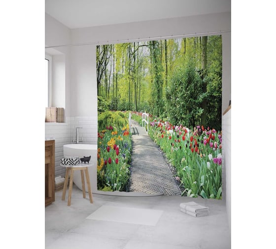 Штора (занавеска) для ванной JoyArty "Мощенная дорожка среди тюльпанов" из сатена, 180х200 см с крючками, sc_10333