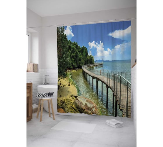 Штора (занавеска) для ванной JoyArty "Мост вдоль берега" из сатена, 180х200 см с крючками, sc_32474