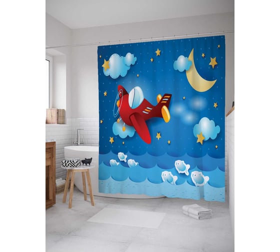 Штора (занавеска) для ванной JoyArty "Мультяшный самолетик в ночном небе" из сатена, 180х200 см с крючками, sc_26892