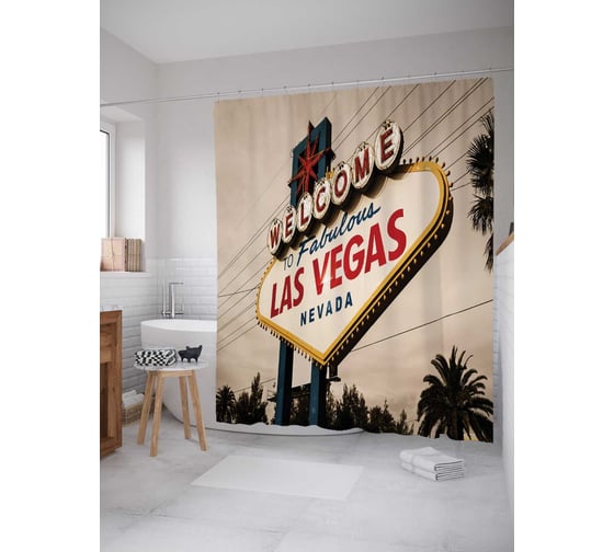 Штора (занавеска) для ванной JoyArty "На въезде в Лас Вегас" из сатена, 180х200 см с крючками, sc_4742