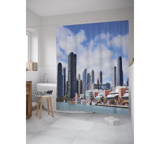 Штора (занавеска) для ванной JoyArty "Набережная Чикаго" из сатена, 180х200 см с крючками, sc_60422