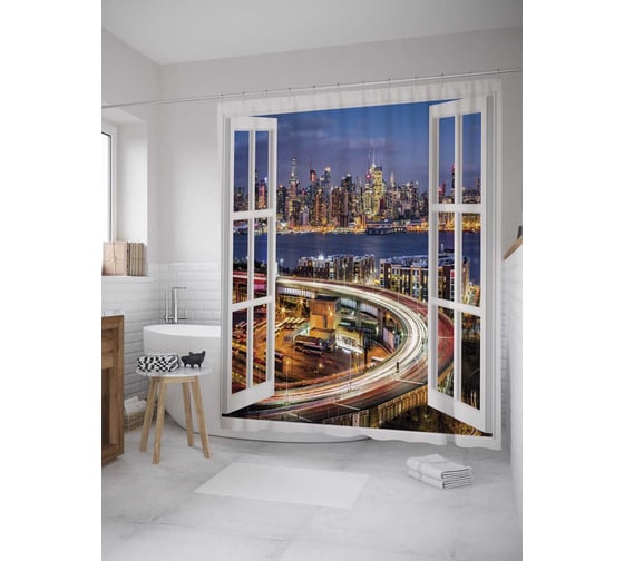 Штора (занавеска) для ванной JoyArty "Ночное окно" из сатена, 180х200 см с крючками, sc_7993
