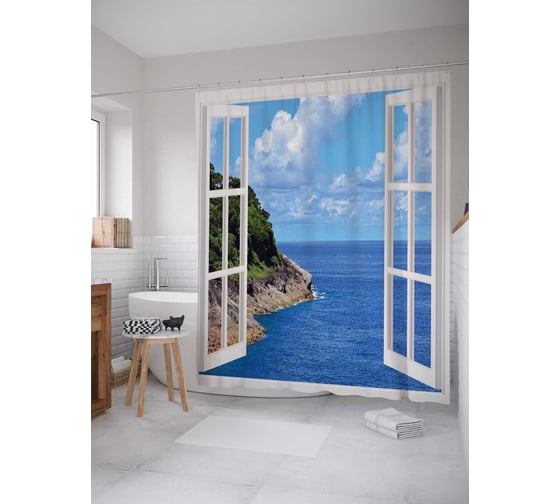 Штора (занавеска) для ванной JoyArty "Облачное окно" из сатена, 180х200 см с крючками, sc_7782